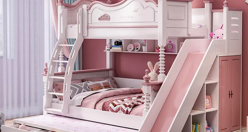 Ev tipi lüks kız çocuk ranzası dolaplı kaydıraklı ranza